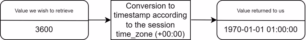 - Cada vez que almacena un valor como marca de tiempo, se convierte en la marca de tiempo de Unix de acuerdo con la zona horaria de la sesión actual.