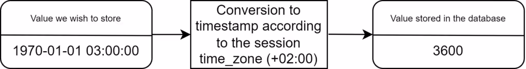 Por ejemplo, supongamos que nuestro desfase de zona horaria es + 02:00 y queremos convertir 1970-01-01 03:00:00 en una marca de tiempo de Unix.